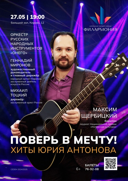 «Поверь в мечту» – концертная программа, представляющая творчество народного артиста России, легенды советской и российской эстрады, автора самых романтичных и мелодичных песен — Юрия Антонова. Многие годы его песни заставляют нас «поверить в мечту» и воплотить её в жизнь. В послужном списке Юрия Антонова значатся самые престижные музыкальные регалии и титулы, миллионы проданных альбомов. Несмотря на то, что в этом году композитор празднует 80-летний юбилей, артист и сейчас остаётся кумиром слушателей, а его песни звучат в эфире многих радиостанций.