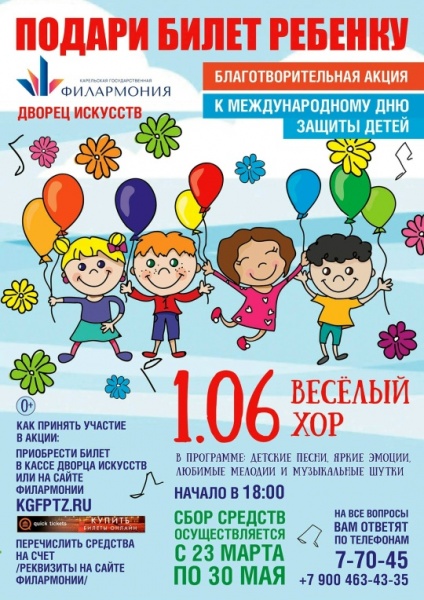 Приобретённые Вами билеты по акции «Подари билет ребёнку» передаются нашему партнёру – Карельскому региональному благотворительному фонду «Материнское сердце». Для участия в акции вы можете выбрать удобный способ:
