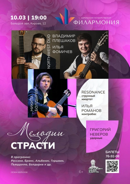 Первое отделение состоит из классических сочинений XIX и XX веков (Россини, Брамс, Альбенис, Пьяццолла), которые исполнит дуэт гитаристов – Владимир Плешаков и Илья Фомичёв. Во втором прозвучат джазовые произведения (Маркин, Болдырев, Гершвин) в исполнении гитариста Никиты Болдырева, Струнного квартета Resonance, контрабасиста Ильи Романова и ударника Григория Неверова.