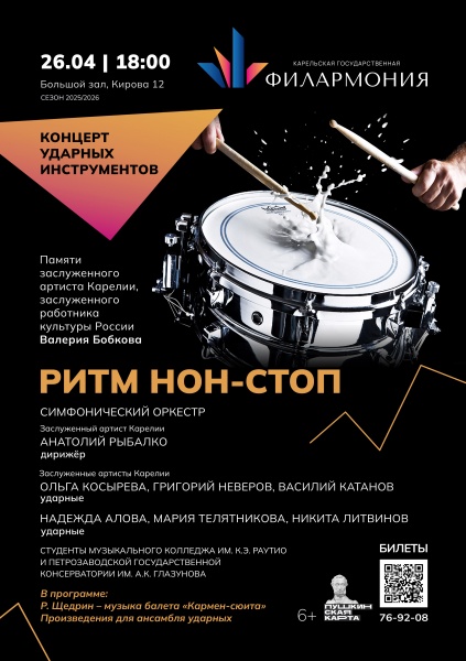 Концерт ударных – невероятно интересное событие! Артисты группы ударных инструментов представят необычную программу, наполненную яркими ритмами, удивительными тембрами и особенным колоритом. Как правило, программу вечера иначе как сюрпризом назвать нельзя, петрозаводская публика практически всегда присутствует на премьерах сочинений.