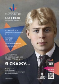 Мужской хор Карельской филармонии открывает новый сезон абонемента «Вечера с Мужским хором» концертом, посвящённым 130-летию со дня рождения великого русского поэта Сергея Есенина.