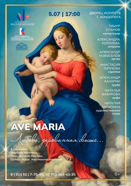 Концерт «Ave Maria. Любовь, дарованная свыше…», который 5 июля прошёл в кондопожском Дворце искусств, был посвящён роли и воплощению в музыке разных эпох молитвы о Деве Марии. Мероприятие состоялось благодаря поддержке Президентского фонда культурных инициатив в рамках проекта, реализуемого Фондом развития культуры «Корела». Специально для этого проекта композитор Владимир Королевский-младший написал сочинение для сопрано, органа, скрипки, арфы и трубы – Камерную симфонию на текст молитвы «Аве Мария».