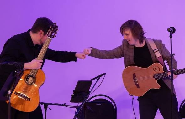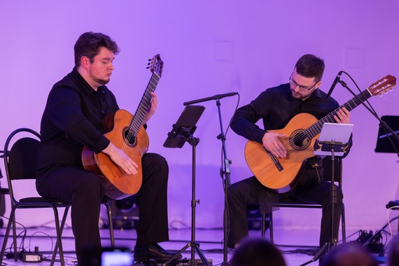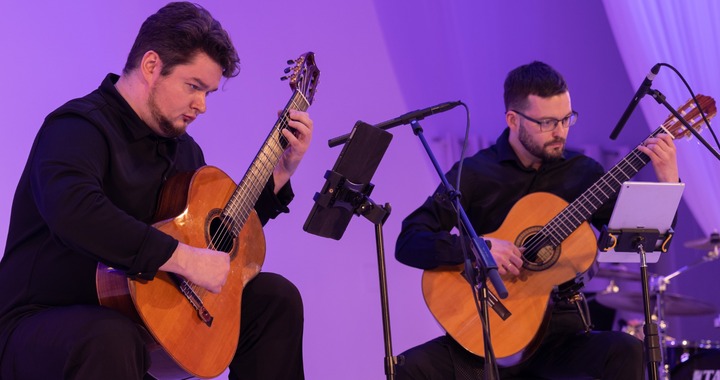 В первом отделении прозвучали классические сочинения XIX и XX веков Джоаккино Россини, Иоганнеса Брамса, Исаака Альбениса и Астора Пьяццоллы, которые исполнил дуэт гитаристов – Владимир Плешаков и Илья Фомичёв.