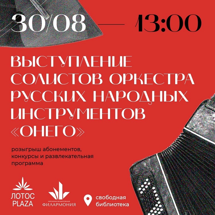 Последняя суббота августа будет особенной: в 13:00 в ТРК ЛОТОС PLAZA состоится выступление солистов Оркестра русских народных инструментов «Онего». Посетители торгового центра станут зрителями живого концерта, атмосфера которого будет лёгкой и радостной – такой, которая дарит нам воспоминания о лете.
