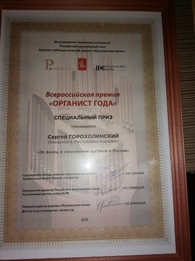 В этом году в номинации «За вклад в сохранение органов в России» награду получил органный мастер Дворца искусств г. Кондопоги, заслуженный работник культуры Республики Карелии Сергей Горохолинский. Также наш коллега был награждён дипломом критико-публицистического журнала «Музыкальная жизнь».