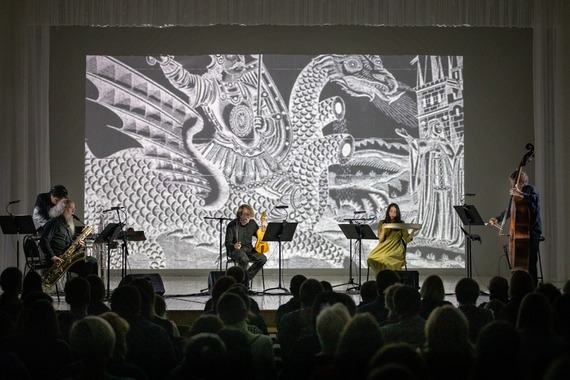 - третий фестивальный вечер, который состоялся 22 октября, был поистине экспериментальным – московский альтист Сергей Полтавский и его коллеги-единомышленники Руст Позюмский (фидл, художественное слово), Алиса Тен (вокал), Сергей Летов (саксофон, флейта) и Владимир Волков (контрабас) представили на суд публики электронную версию сказок Архангельской области, погрузив аудиторию в звуки электроники, эмбиента и дарк-джаза. Мультимедийный электронно-музыкально-литературный проект «Северные сказки» на экране сопровождали ожившие лубочные рисунки художника Дмитрия Лапшина и аватары самих исполнителей. Сергей Полтавский, которого публика знает по академическим альтовым программам, выступил в этом проекте в роли композитора, аранжировщика и службы технической электронной поддержки;